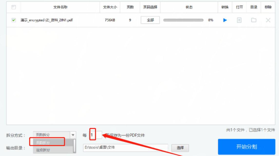 4.点击打开按钮之后我们就可以在界面左下角来选择分割PDF文件的方式了,选择页面拆分的话就是将文件按照每几页分割成一个文件的方式进行分割。