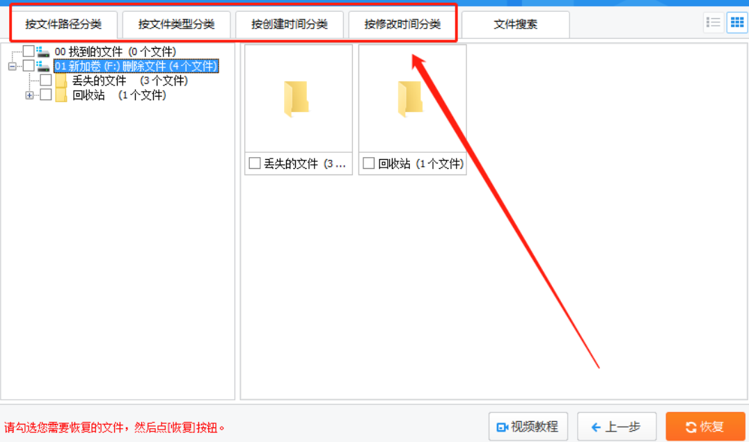 3.等到扫描操作完成之后我们在界面中就可以看到扫描出来的文件了,在下图中框出的位置就是文件的分类方式,用户选择按分类方式来查看文件会比较方便。