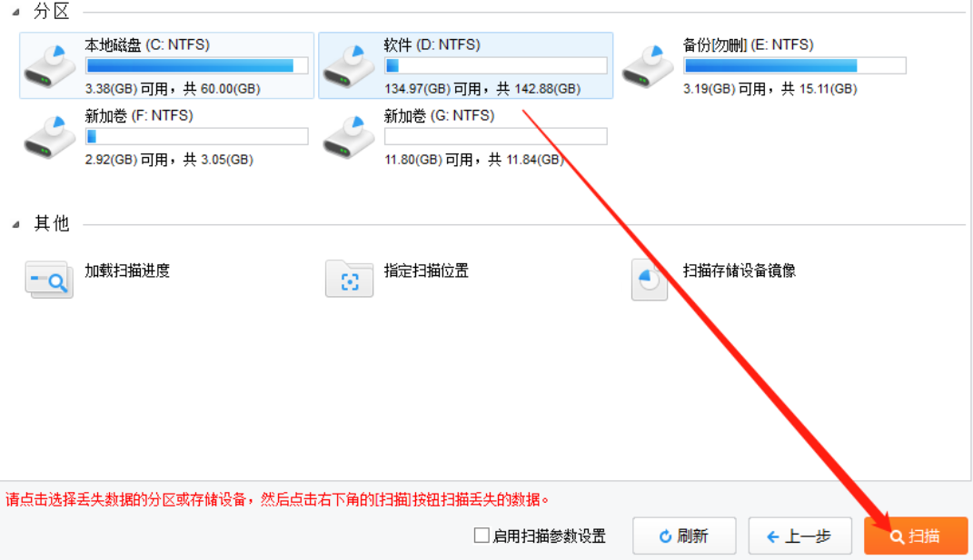 2.点击开始恢复按钮之后下一步是选择恢复删除文件的磁盘,选中磁盘之后点击右下角的扫描按钮即可扫描磁盘中的已删除数据。