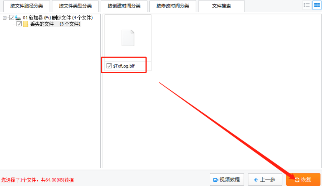 5.点击搜索之后在搜索结果界面就可以看到我们想要恢复的文件了,选中文件的方框之后点击界面右下角的恢复按钮即可进行恢复。