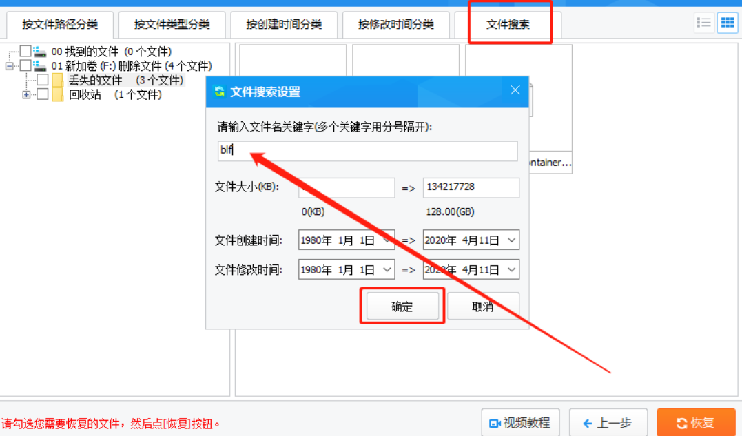 4.另外我们也可以点击文件搜索功能,然后在出现的界面中输入想要恢复的文件名称关键字来进行搜索,可以输入文件名称或者文件的后缀类型进行搜索,这样能够快速的找到想要恢复的删除文件。