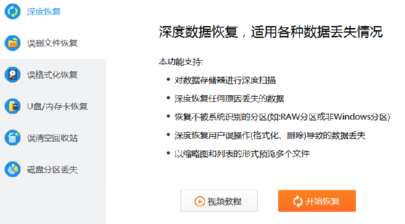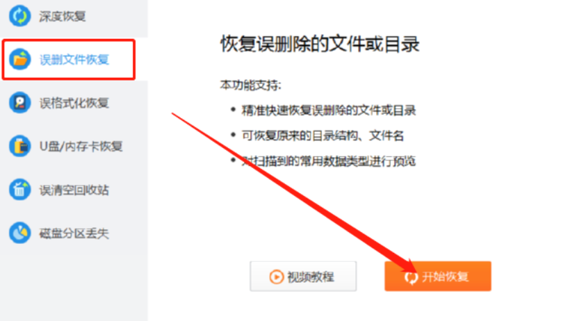1.首先第一步我们打开软件之后在界面左边点击误删文件恢复这个功能,选中之后点击界面中的开始恢复按钮。