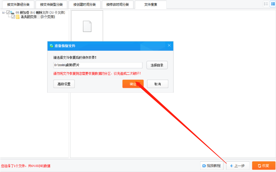 6.点击恢复按钮之后会出现一个准备恢复文件的界面,点击界面中的选择目录按钮可以打开选择恢复文件保存目录的界面。