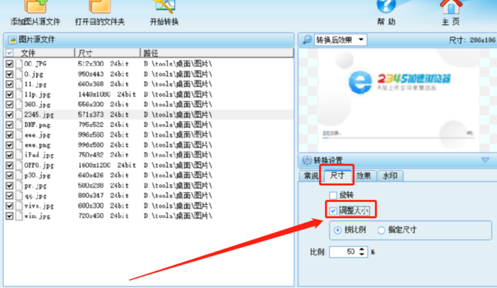3.点击打开按钮将图片成功添加到软件界面之后,我们就可以在右边切换到尺寸这个功能中了,然后勾选调整大小这个功能选项。