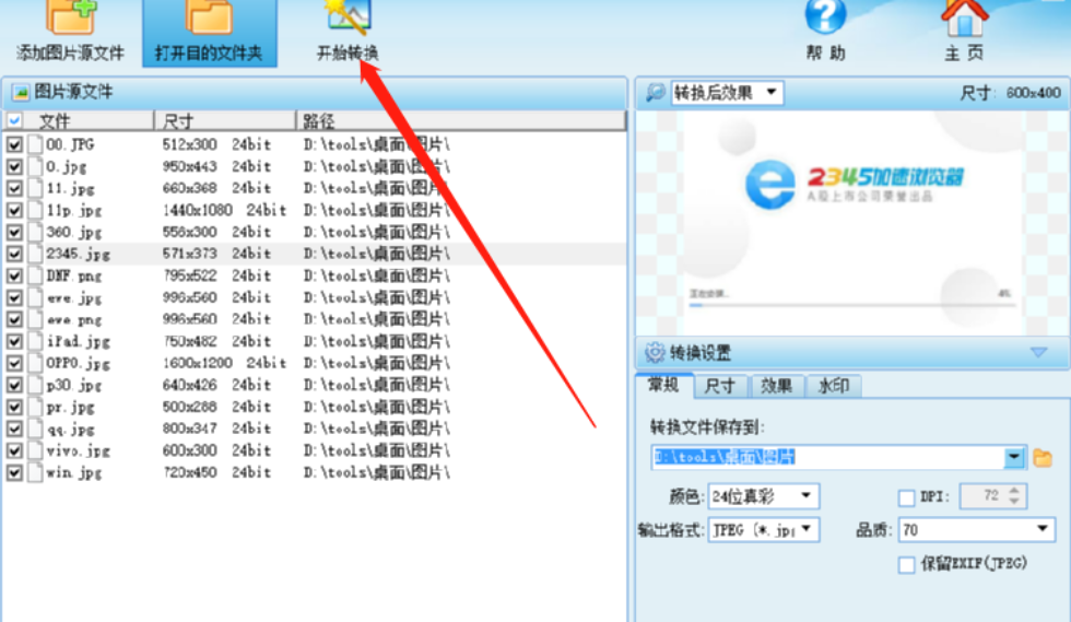 6.最后一步我们只需要在主界面中点击上方的开始转换这个按钮就可以开始批量调整图片的大小了。