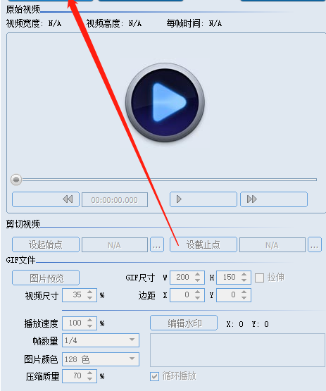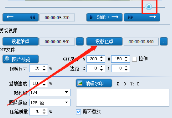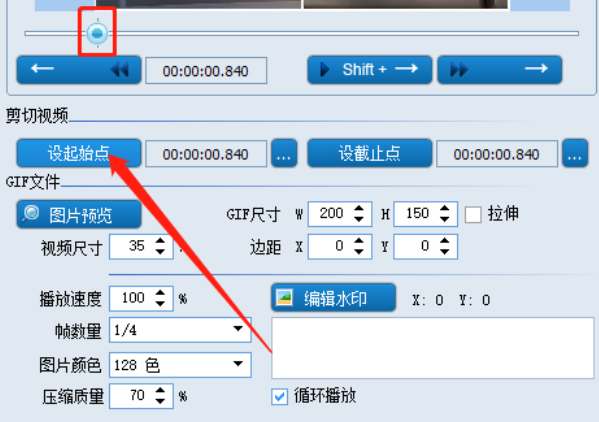 3.点击打开按钮之后我们就可以开始设置想要转换的视频片段了,移动进度条中的圆点之后点击设起始点按钮即可选择视频片段的开始位置。