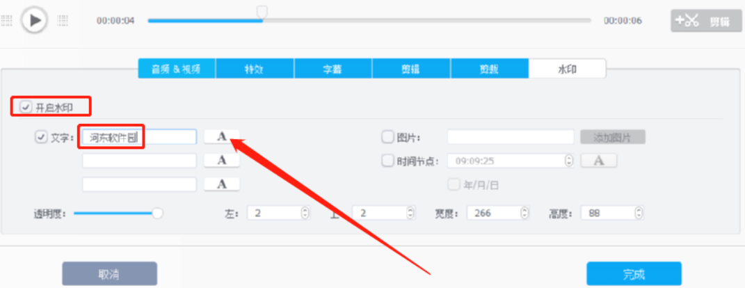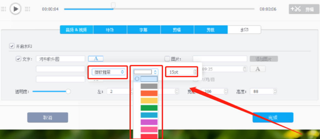 6.点击这个A图标之后可以对文字水印的字体、颜色、大小等参数进行调整,我们根据自己的需求来进行调整即可。