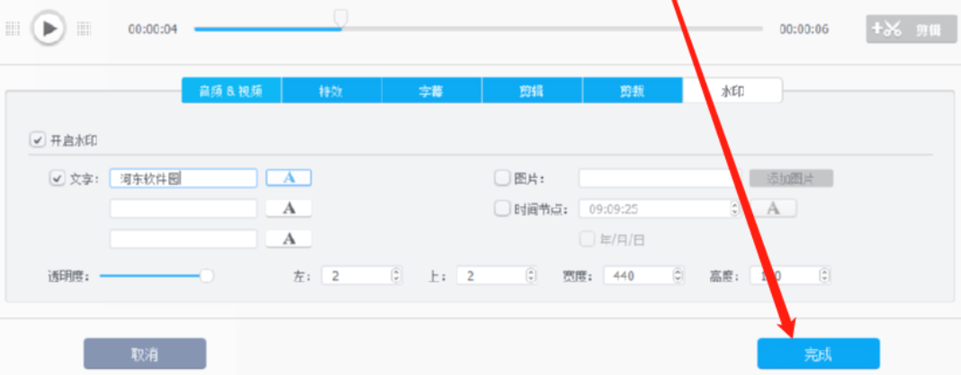 7.调整完成之后在右边的视频界面中可以看到水印的效果,满意之后点击下方的完成按钮即可。