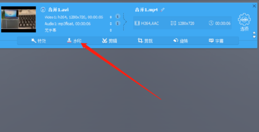 4.点击打开按钮之后视频就成功添加到软件界面了,然后我们需要在视频列表的位置点击水印这个功能。