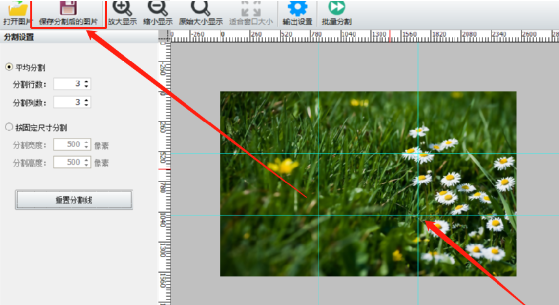5.点击重置分割线按钮之后就可以在界面中的分割辅助线看到我们设置的分割参数分割图片之后的效果了,满意的话点击界面左上方的保存分割后的图片按钮。
