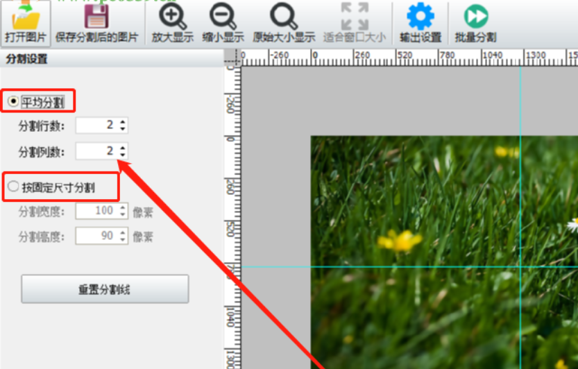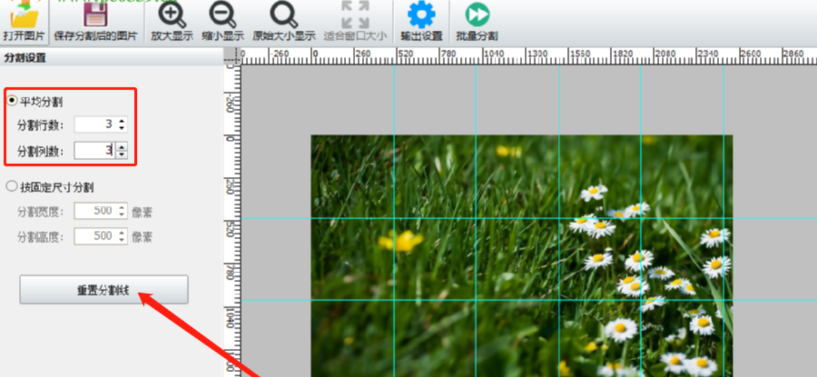 4.选择好分割模式之后我们设置分割的一些参数,平均分割模式的话就需要输入分割的行数和列数,输入之后点击重置分割线按钮。