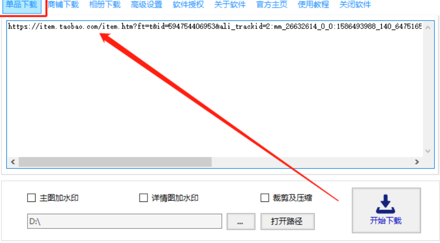 1.首先第一步我们打开软件之后在软件界面左上角点击单品下载功能,然后将想要下载的淘宝商品链接复制到软件中。