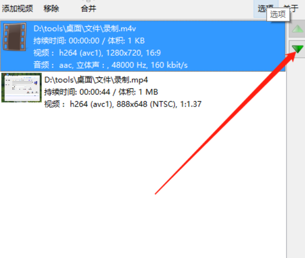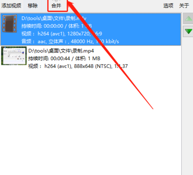 3.点击打开按钮之后我们在界面中就可以看到选择添加进来的视频文件了,然后我们点击选中视频然后点击右边的上下三角图标可以调整它们的合并顺序。
