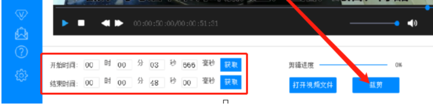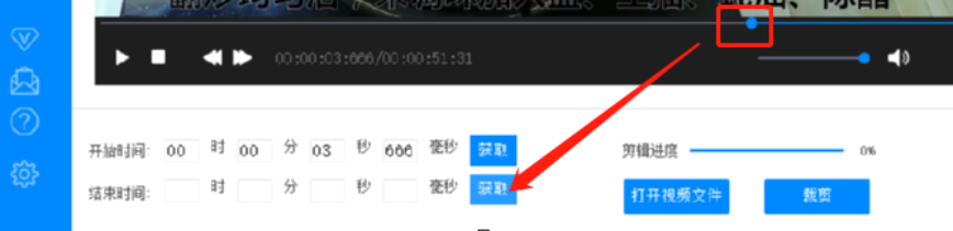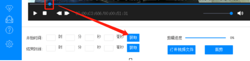 3.点击这个打开按钮之后下一步视频就进入到软件的剪切界面了,然后我们移动视频进度条上的圆点可以选择想要剪切视频的开始时间,移动到指定位置之后点击获取按钮就可以获取剪切视频片段的开始时间了。