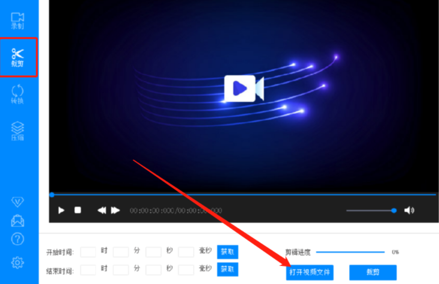 1.首先第一步我们打开软件之后点击软件左边的裁剪功能,切换到裁剪功能界面之后点击界面下方的打开视频文件这个功能按钮。
