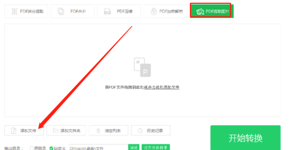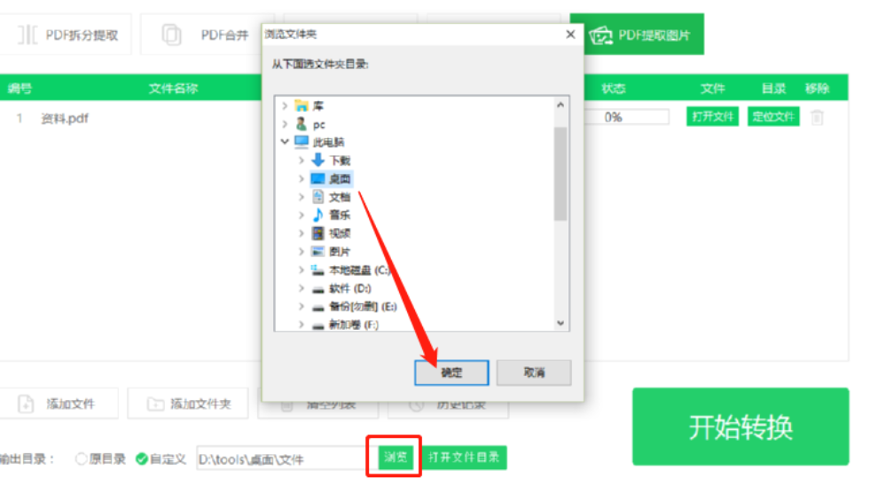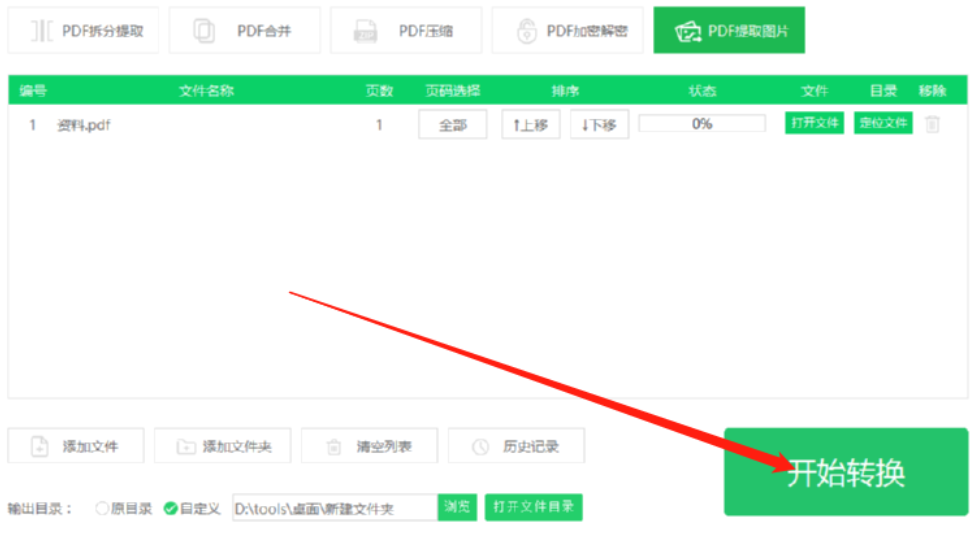 4.设置好图片的输出保存位置之后我们点击界面右下角的开始转换按钮就可以开始转换提取PDF文件中的图片了。
