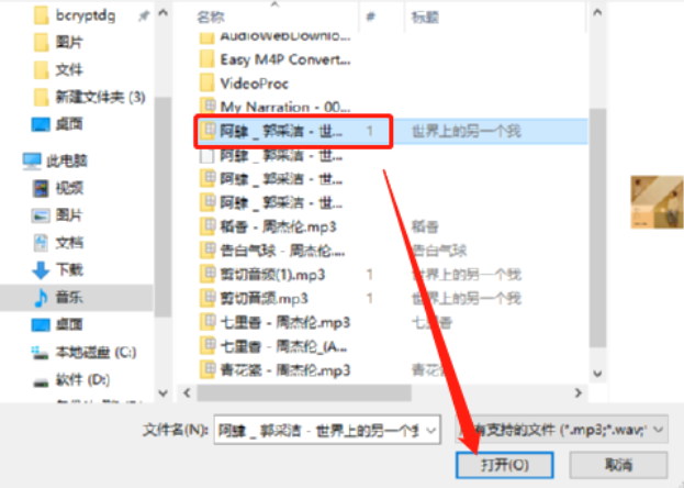 2.点击添加音频之后紧接着在打开的选择音频界面中,我们选中想要转换的MP3音频文件之后点击下方的打开按钮。