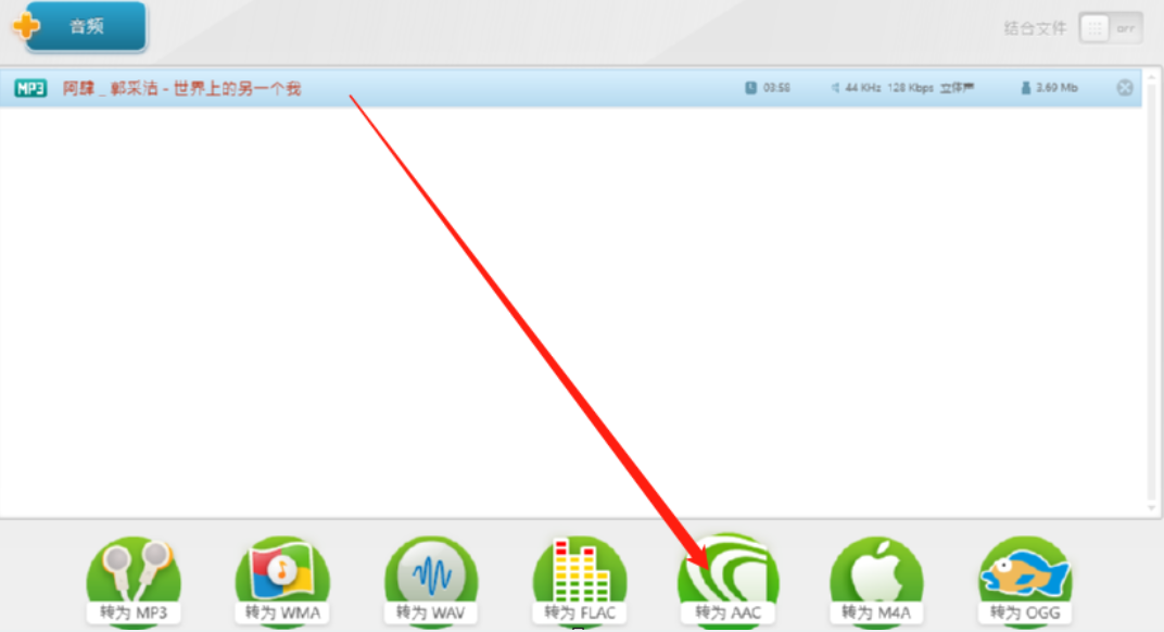 3.点击打开按钮之后选择的音频文件就成功添加到软件界面中了,然后我们点击选择下方的转为AAC这个功能图标。