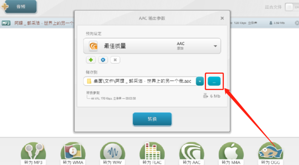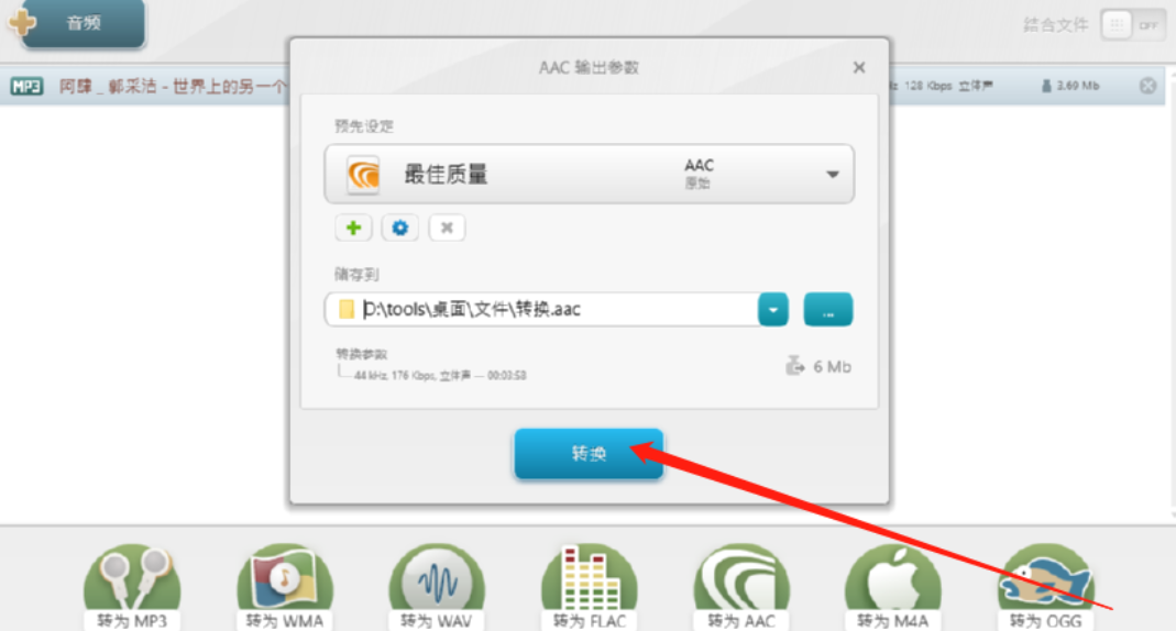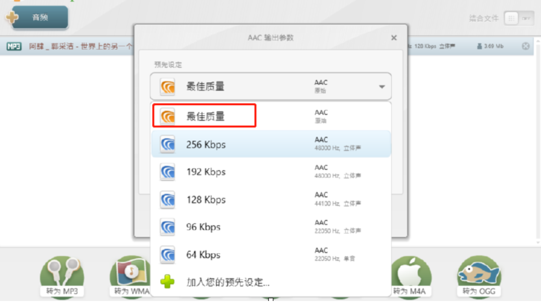 4.点击转为AAC之后会出现一个配置AAC文件输出参数的界面,在界面中可以选择AAC文件的质量。