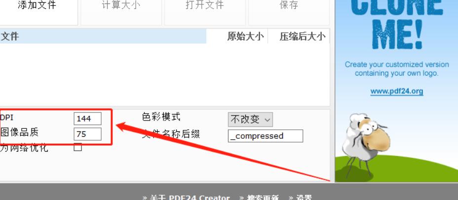 2.点击进入到压缩功能界面之后我们需要先设置压缩PDF文件的参数,有DPI值和图像品质的值可以设置,将数值调低的话相对的压缩率就高一些。