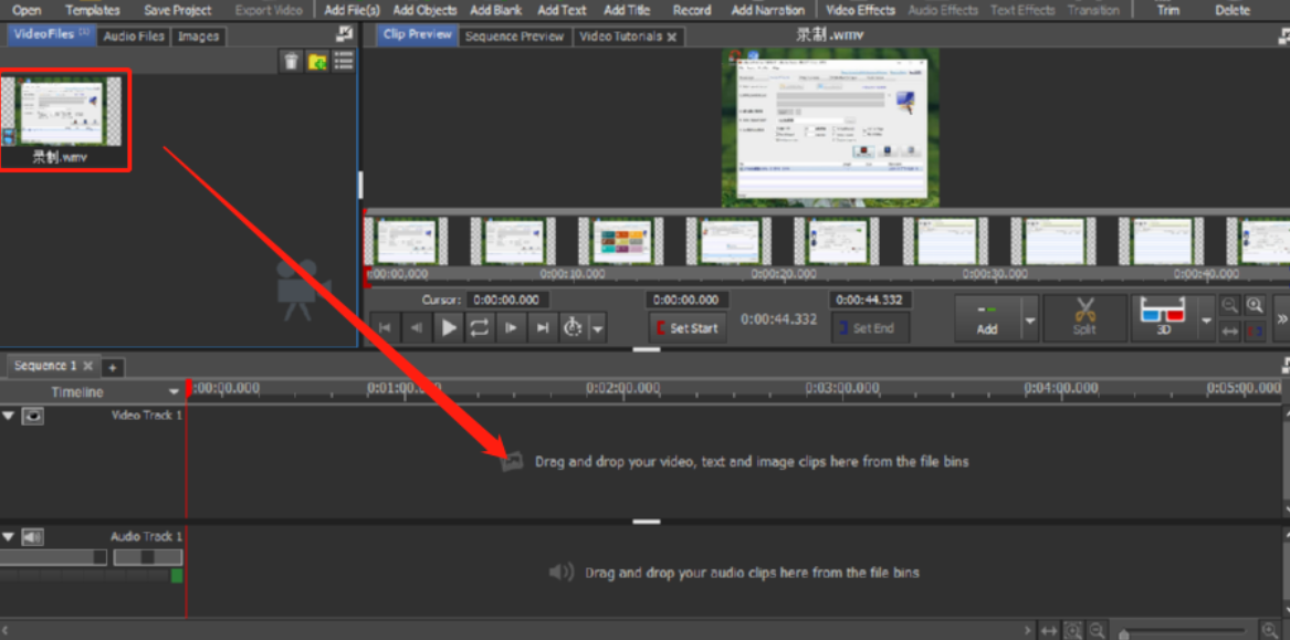 3.点击打开按钮之后视频就添加进来了,然后我们需要选中添加的视频将它移动到下方的操作台当中。