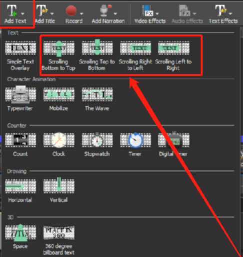 4.将视频移动到操作台之后我们点击上方的添加文字功能,在出现的界面中选择添加文字的方式,框出的位置分别是上下左右的添加文字方式,也就是文字从视频的哪个方向出现,用户根据自己的需求选择即可。