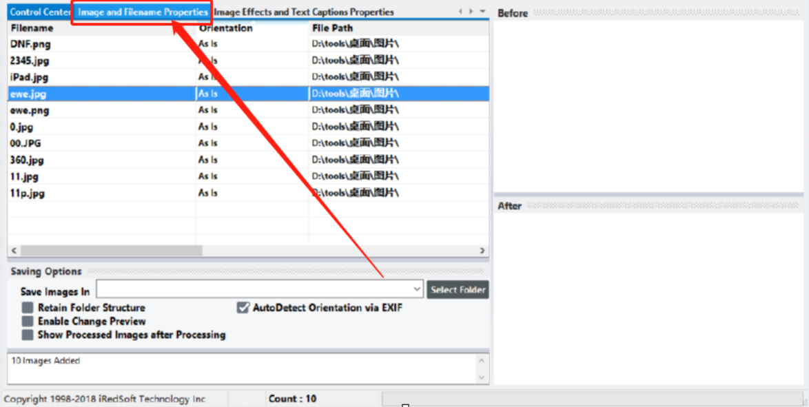 3.点击打开按钮之后我们的图片就添加到软件中了,然后下一步我们需要点击界面上方的“Image and Filename Properties”这个选项。
