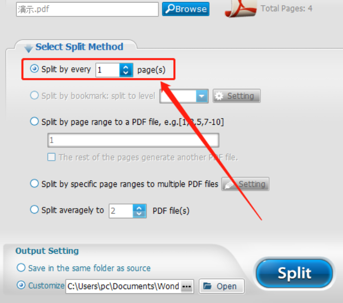 3.点击打开按钮将文件成功选择添加进来之后,下一步我们就可以选择分割的方式了,小编使用的这个分割方式是按照文件的页面数量进行分割的,可以设置每多少页分割成一个文件。
