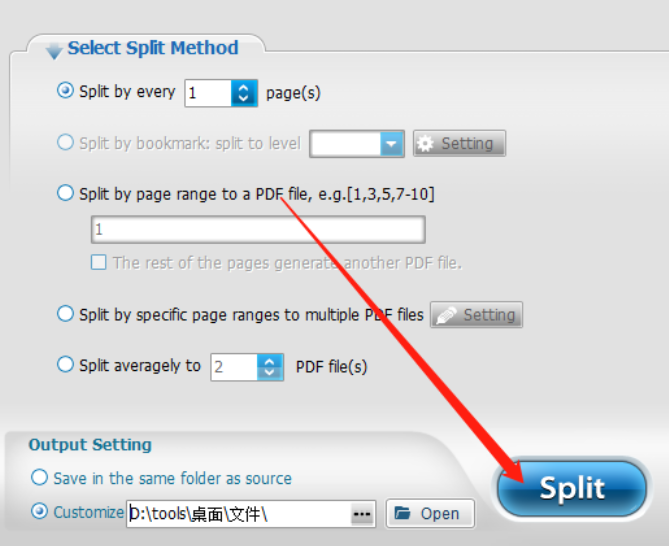 5.最后在设置好保存文件的文件夹之后我们点击界面右下角的Split这个功能按钮就可以开始分割选中的PDF文件了。