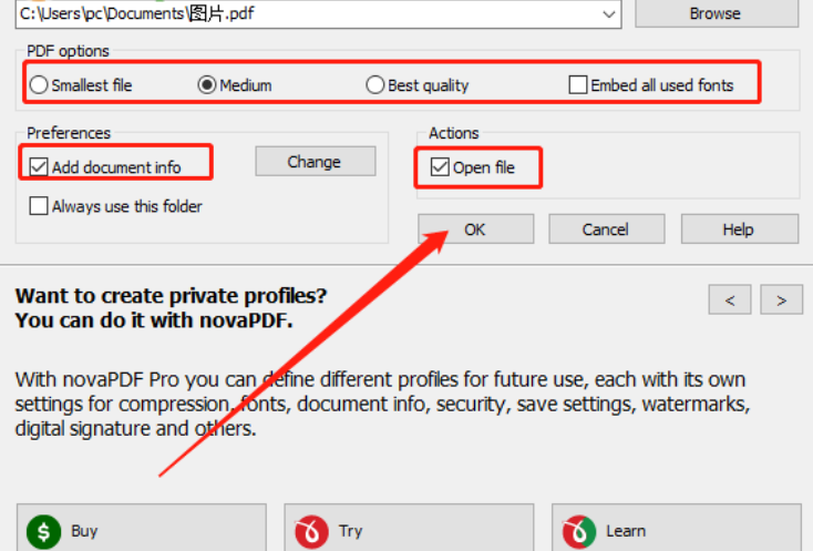 5.紧接着下一步我们在PDFOptions这个模块中可以选择PDF文件的清晰度,大家根据自己的需求进行勾选即可,然后可以勾选添加文件信息以及动作完成之后自动打开文件的功能,勾选之后点击OK按钮即可。