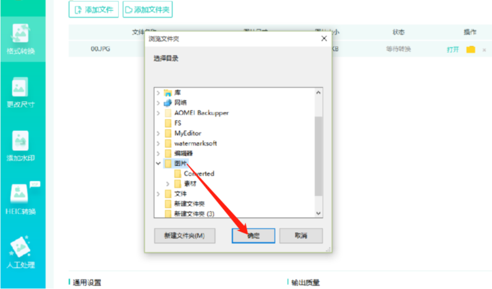 2.点击添加文件夹按钮之后就出现一个浏览文件夹的界面了,我们在这个界面中选中想要转换的图片所在的文件夹,然后点击确定按钮。