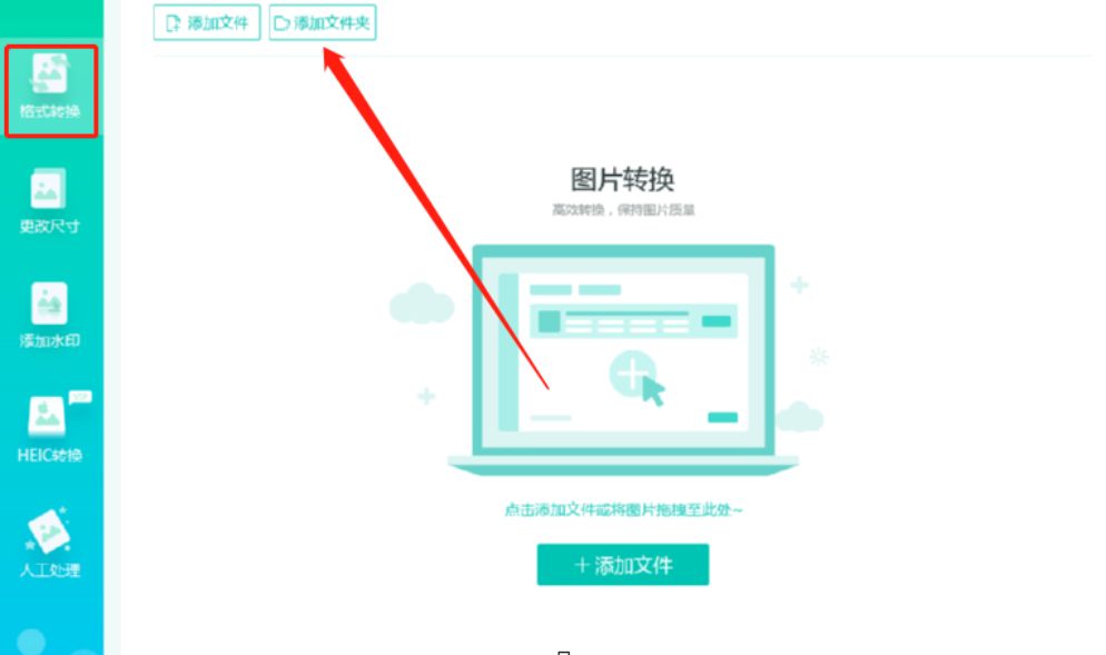 1.首先第一步我们打开软件之后点击界面左边选中格式转换这个功能,选中之后点击界面中的添加文件夹按钮。