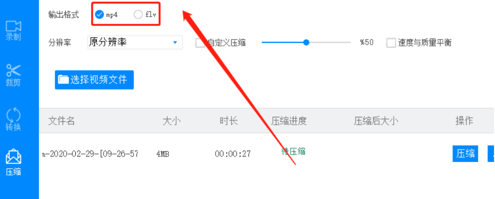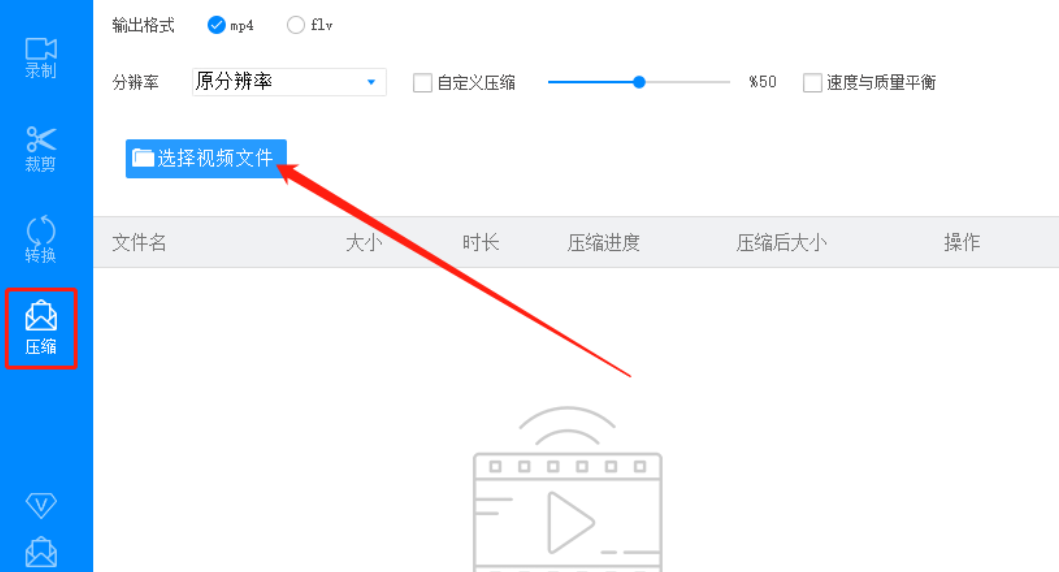 1.首先第一步我们打开软件之后在界面左边点击切换到压缩这个功能模块,点击切换到压缩功能之后点击选择视频文件这个功能按钮。