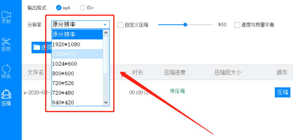 4.另外我们还可以在分辨率这个下拉列表中选择压缩之后的视频分辨率,也可以勾选自定义压缩选项来调整压缩百分比。