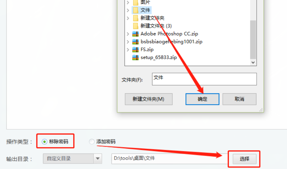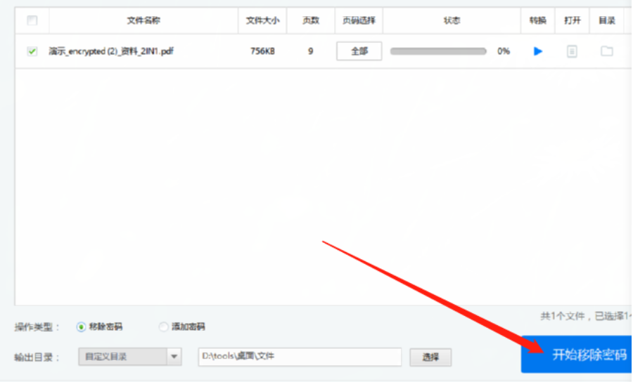 4.点击打开按钮之后我们在操作类型中选择移除密码这个功能,然后点击选择按钮即可在出现的界面中选择文件移除密码之后的输出位置。