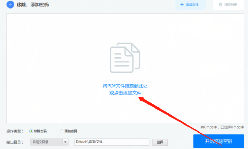 2.进入到移除、添加密码功能界面之后,我们在界面中点击添加文件图标,点击之后添加需要移除密码的PDF文件。