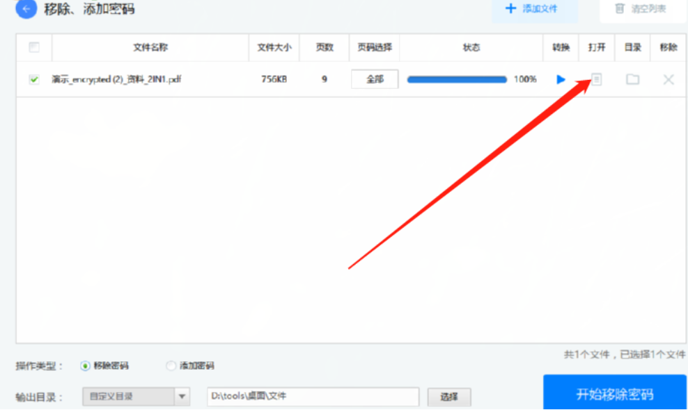 6.等到移除密码操作完成之后我们点击上方打开选项下面的文件夹图标即可打开查看移除密码之后的PDF文件。