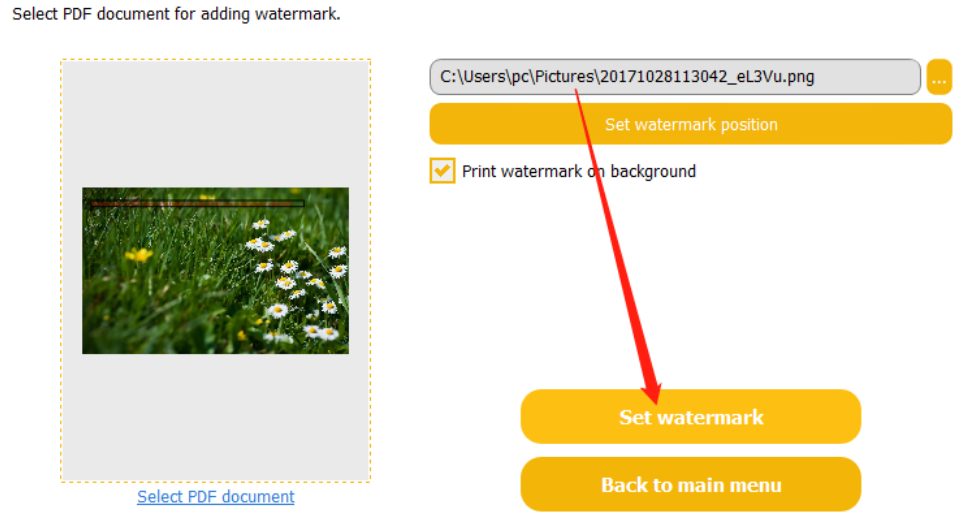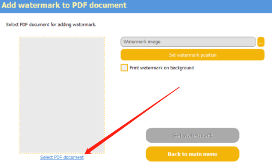 2.进入到水印功能界面之后,我们点击界面左下方的Select pdf document这个选项准备添加PDF文件。