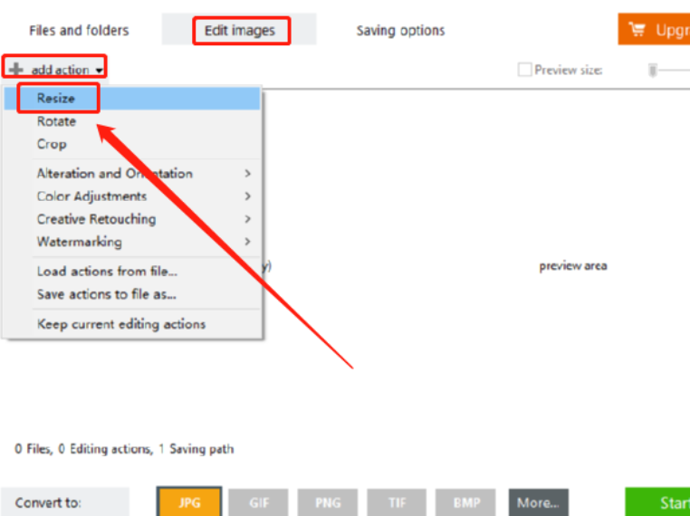 3.点击确定按钮之后我们切换到Edit images这个编辑图片的功能中,然后点击添加动作按钮,在出现的选项中选择Resize这个修改尺寸选项。