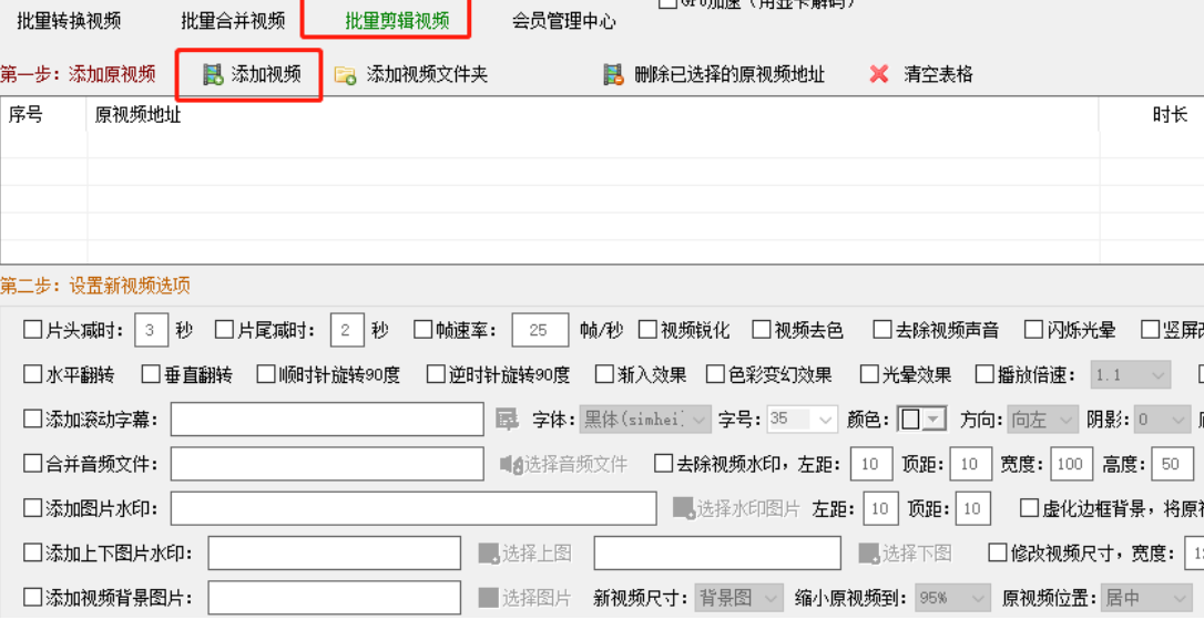 1.首先第一步我们打开软件之后在界面中点击批量剪辑视频这个功能,然后点击添加视频按钮准备添加视频文件。
