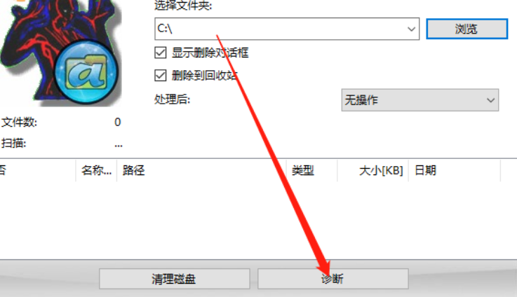 3.点击确按钮之后文件路径就选择完成了,然后我们点击界面中的诊断这个功能按钮可以扫描路径中的不能正常删除的文件。