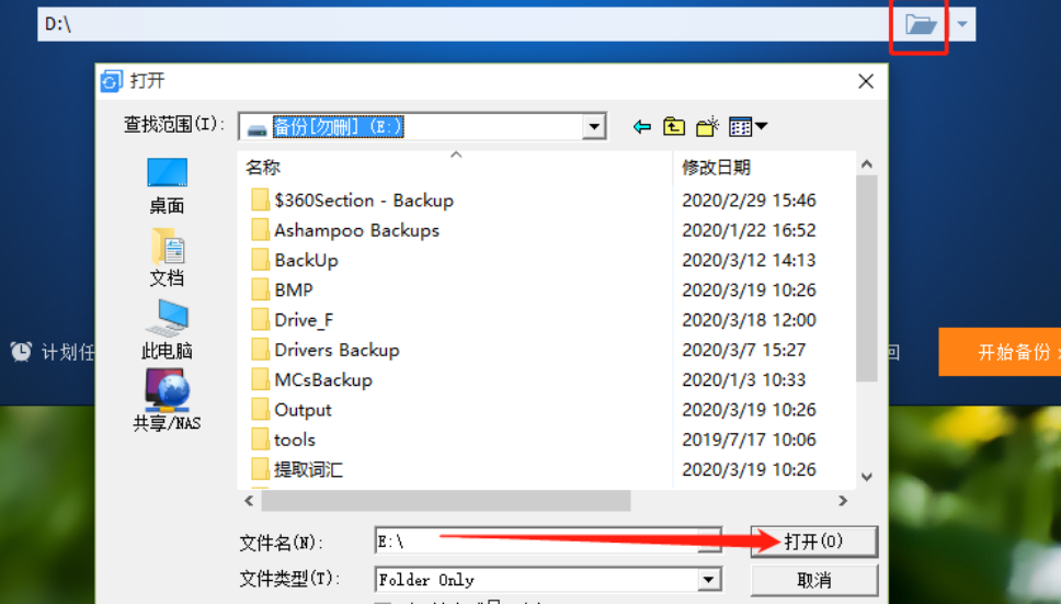 4.点击打开按钮之后我们下一步是点击保存备份文件夹路径后面的文件夹图标,点击之后可以选择文件夹备份的储存位置,也就是备份文件夹的目标路径。