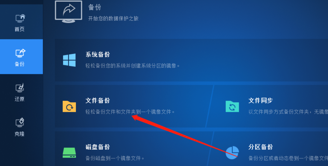 1.首先第一步我们打开软件之后在备份这个模块中找到文件备份功能,然后点击进入到文件备份功能界面中。
