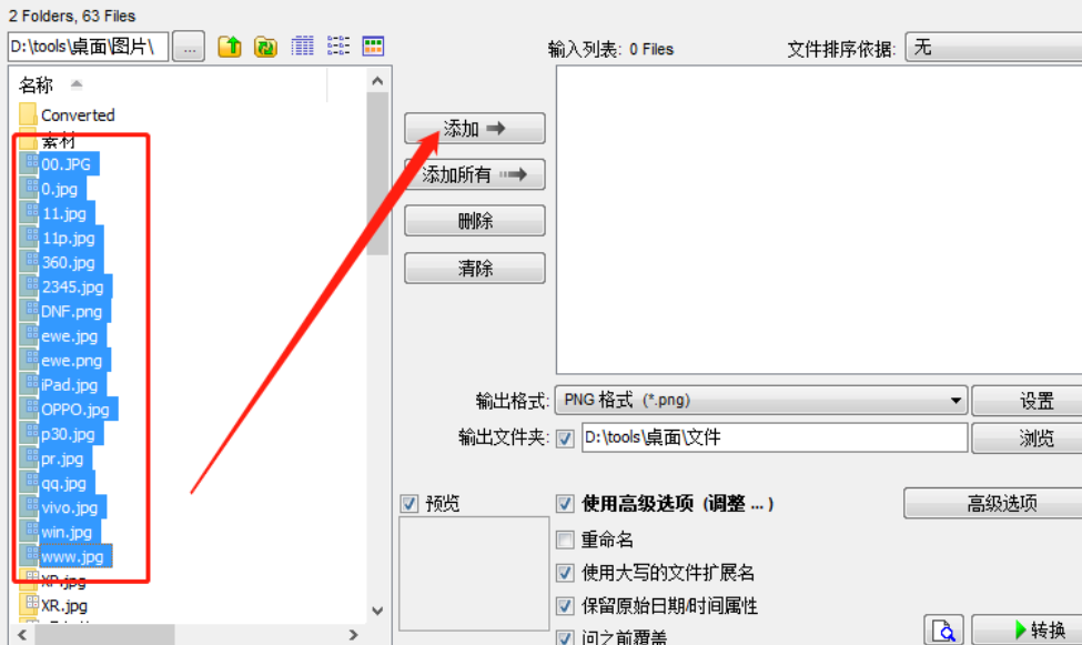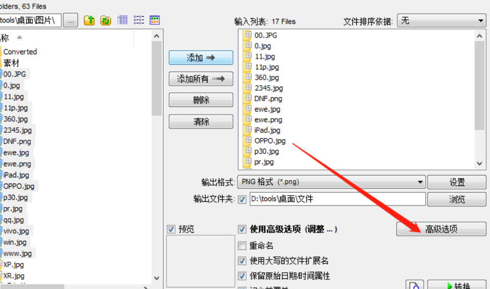 3.点击这个添加按钮之后我们就将选择的图片添加到操作列表当中了,然后下一步就是点击界面右下方的高级选项。