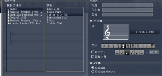 可根据自己实际情况选择,这里我们选择从模板新建,下面进行基本设置。从模板创建一般用软件给你的模板,打开现有的乐谱是用于自己保存的乐谱,导入文件文件中保存的乐谱。