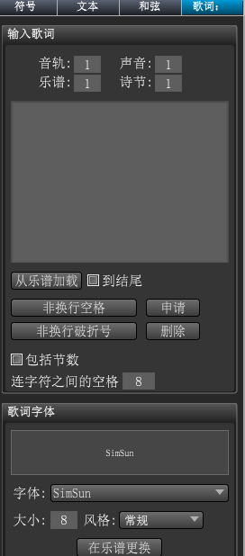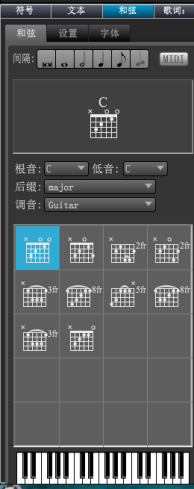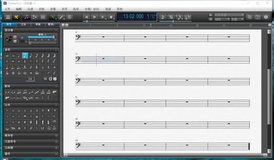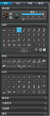 你的左边是最常用的的符号,琴谱的符号都可以到这里找到,只需要单击你需要的符号然后单击琴谱就可以把你的符号添加到琴谱上面了,只要你没有更换其它的符号可以一直添加这一个符号。