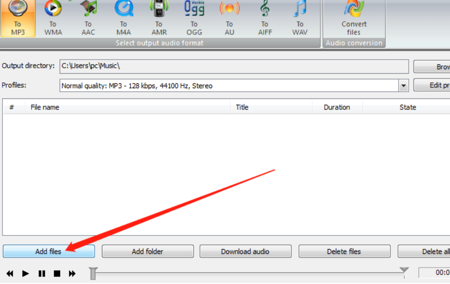 1.首先第一步我们打开软件之后在界面的左下角点击Add files这个功能按钮,点击之后添加想要转换的MP3文件。