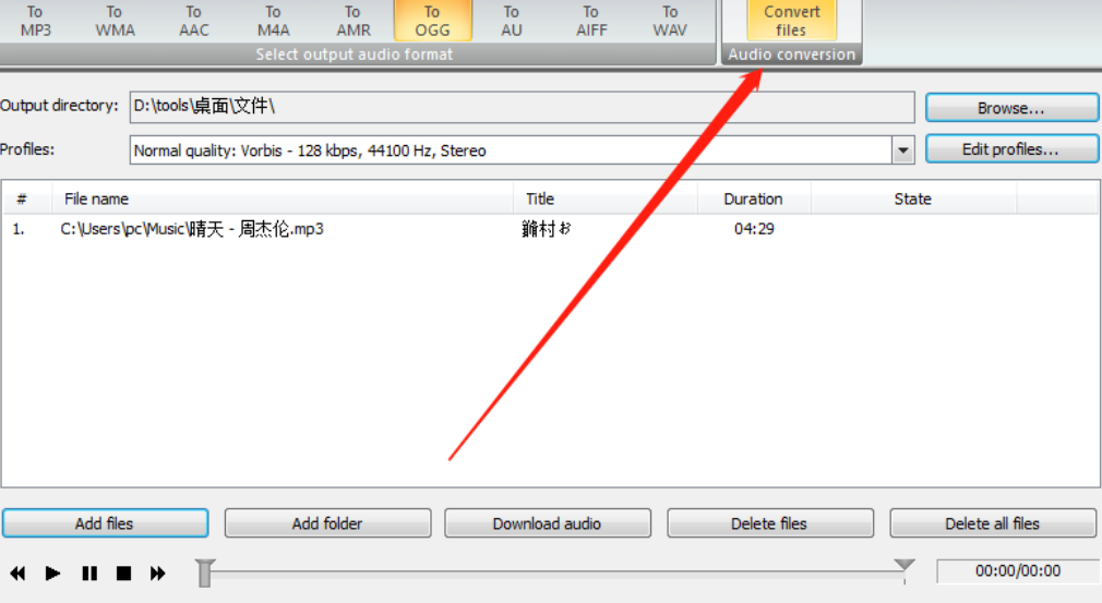 3.点击打开按钮之后我们在界面中就可以看到添加的音频文件了,然后我们在上方点击To OGG按钮即可选择将MP3转换成OGG格式。