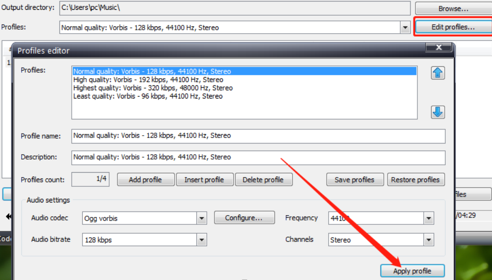 4.之后我们点击格式后面的Edit profiles这个功能按钮可以打开编辑文件参数的界面,包括音频的一些声道、清晰度等,用户根据个人需求选择设置即可。