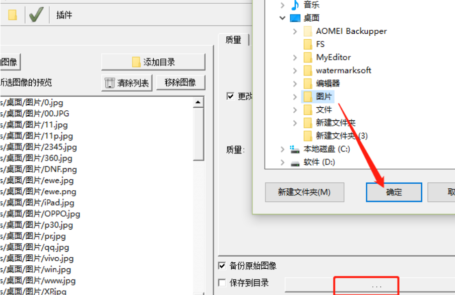 4.设置好压缩质量之后在下方点击保存到目录旁边的三点按钮,点击之后在出现的界面中选中压缩之后储存图片的文件夹并点击确定按钮。
